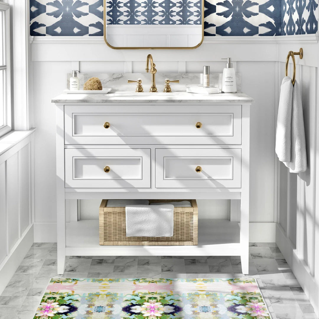 Inspired by Laura Park’s original artwork, the Amber Fresco floor mat pairs vibrant pinks and navy with subtle blue-green hues. Designed for everyday use, it brings color and personality to kitchens, bathrooms, and entryways.